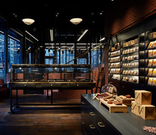 木、レンガ、ガラス、鋼が印象的な機能美を追求したクラフトマンシップ溢れるオーセンティックな空間には、デザートサロン「ル・サロン」が併設されており、工房の様子を垣間見ながらショコラを使ったデザートをご堪能いただけます。商品はすべて、パリ工房でカカオ豆から作られたクーベルチュールを使用し、東京工房で製造しています。現在では、国内7つのブティックとオンラインブティックを通じてショコラの魅力を伝えています。