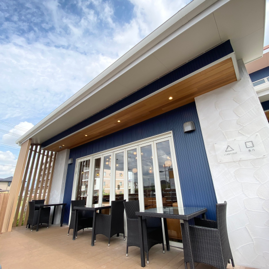 ブルーの外壁と木の温もりを感じるテラスがあり、お洒落な雰囲気☆