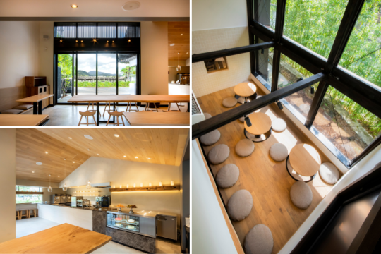 店内中央の印象的な全長4mもの大きな一枚板のテーブルや、移りゆく嵐山の景観を望むカウンター、