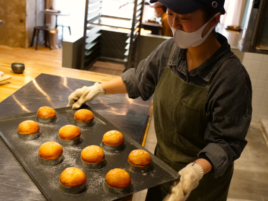 開放的な販売スペースに、良いお菓子は良い環境からを表現する、の信念の元、広々したフルスペックの厨房を実現。店頭(表)と厨房(裏)、と明確に分けることはせず、厨房空間の延長線上に販売スペースがあるように設計をしました。