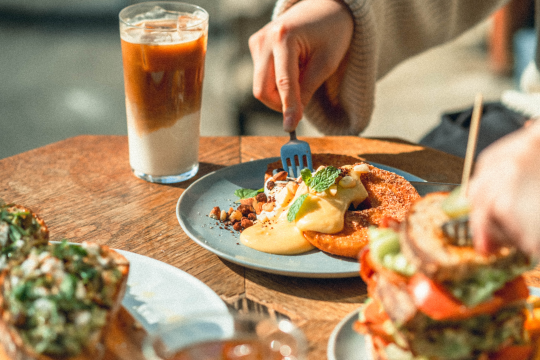 大きな扉から差し込む光、オープンキッチンの開放的な空間、併設するベーカリーで毎朝焼き上げる自慢のパンを使い、モーニングやランチではサンドイッチやハンバーガーを中心に、カフェタイムではドーナツや日替わりケーキなどの焼き菓子を中心にご提供しています。