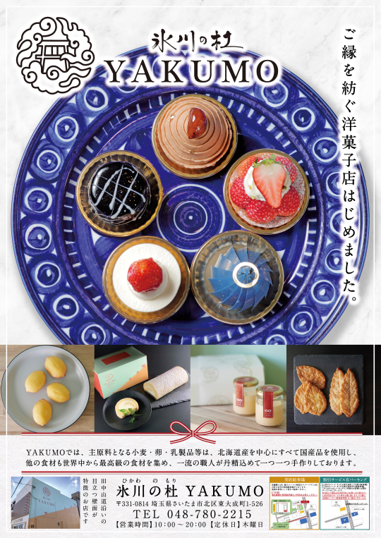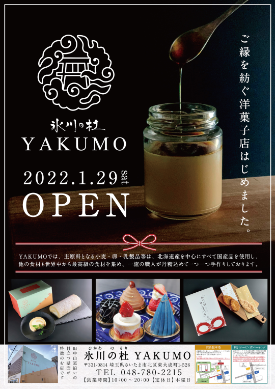 東京都、神奈川県、埼玉県、千葉県の一部の店舗様には週4回自社配送便でチルド、冷凍ケーキをお届け、その他の地域は北海道から沖縄県までのお客様に冷凍ケーキを発送しています。今年1月さいたま市北区東大成町に大宮の銘菓を創作する直営店舗「氷川の杜YAKUMO」をオープンしました!