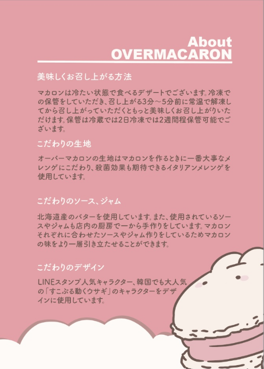 良い材料(北海道バター、100%アーモンド、毎日作る手作りジャム)を使用し、厳しい製造方法で製造して甘さ控えめでおいしウサギトォンカロンを毎日製造しています。