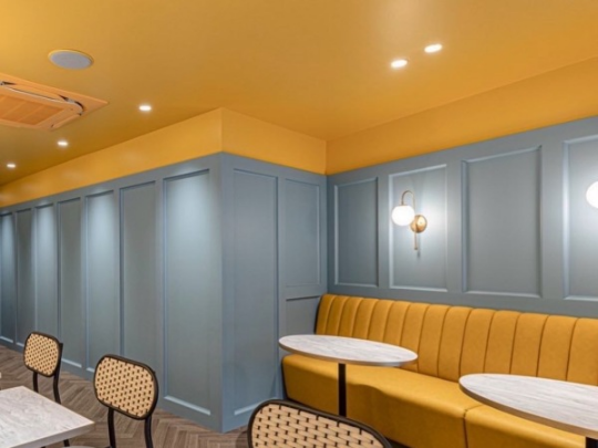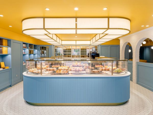 フランスの洋菓子店をイメージしたイエローとブルーのカラーに彩られた明るい雰囲気があります。
