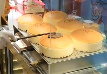 トレードマークの「りくろーマーク」の刻印がされたふわふわのチーズケーキは、店頭で製造、販売されており、