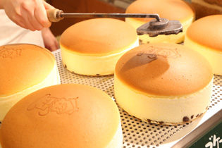 トレードマークの「りくろーマーク」の刻印がされたふわふわのチーズケーキは、店頭で製造、販売されており、