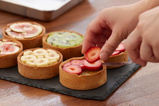アリュマージュラボラトワでは、味と⾒た⽬のコントラストが楽しい、カリカリのクッキー⽣地と滑らかなフラン、⾊鮮やかでジューシーなフルーツの組み合わせが織りなす「クッキーフラン」という新感覚のスイーツをご提供いたします。