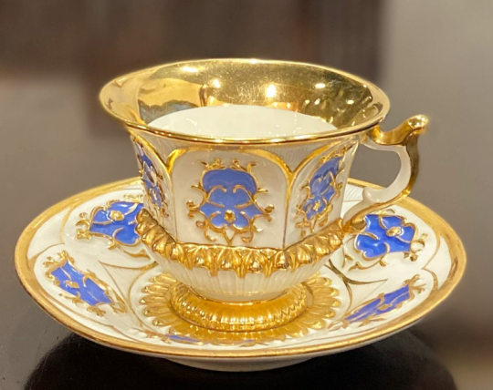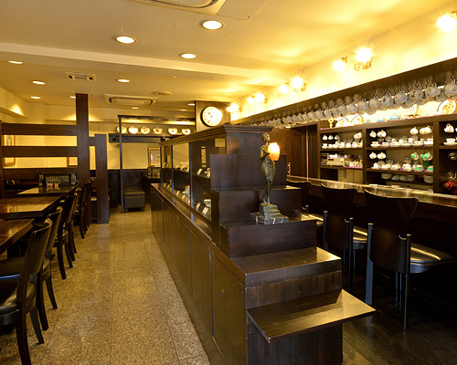 ヨーロッパ名窯のコーヒーカップやアンティークカップがいっぱいの美術館のような店内。