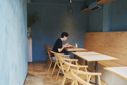 代々木公園駅から徒歩30秒の場所にある、水色の外観・内装のカフェです。