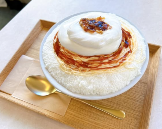 従来のかき氷は氷を削っていますが、当店のかき氷は氷を使わず、特性のミルクを凍らせて削っています。