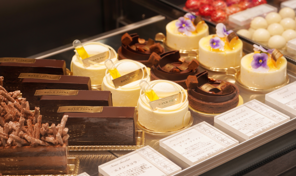 四季の素材を使ったケーキや高級チョコレートが並び、隠れ家バーではチョコとカクテルのペアリングも楽しめます。