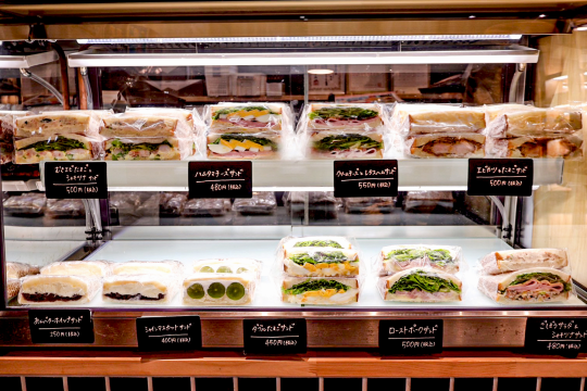 看板メニューの食パン「サンセリテ」をはじめ、菓子・惣菜パン、サンドウィッチなど常時30種類以上の商品が店頭に並んでいます。