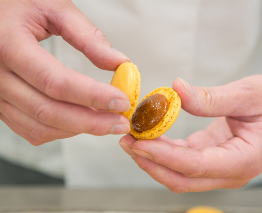 ラデュレは20世紀半ばに二つのマカロンの間に美味しいガナッシュを挾むことを考案。今では毎シーズン新しい味を創作しています。新しい味を作るにあたって、風味はもとより色のパレットにも気を配っています。