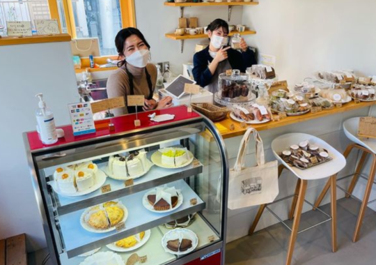 店内には焼き菓子や生菓子が並び、カフェスペースも併設しています。バースデーケーキやオンライン販売にも力を入れています!