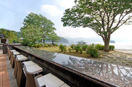 テラスにある足湯カウンター席では、芦ノ湖温泉の足湯を楽しめ、2Fでは芦ノ湖を望む景色を楽しみながらコーヒーや紅茶などをお召しあがりいただけます。