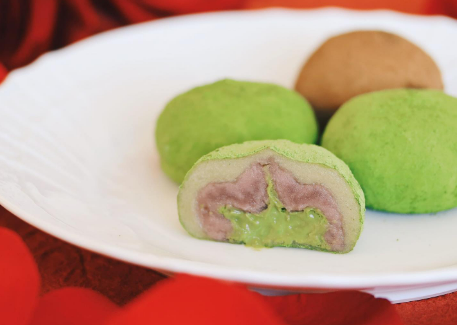 大和茶の美味しさをより深く味わっていただくために、3種類の大和茶を使用し、抹茶クリーム、塩餡、抹茶餅、抹茶パウダーの4重構造の大福づくりへ辿り着きました。