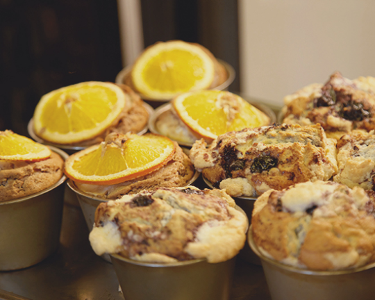 温かみのある店内には、フルーツがごろっとまるまる。季節を感じられるマフィンがずらりと並びます。