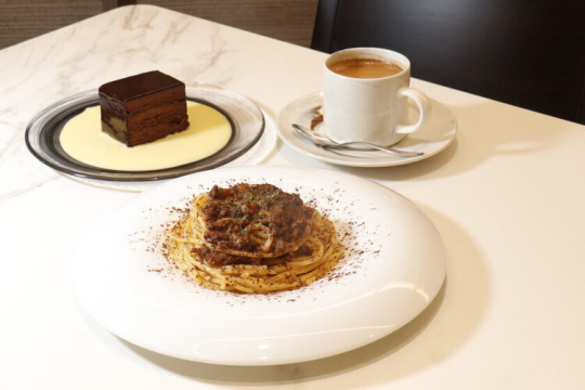 チョコレートを活かしたデザートやアフタヌーンティー、カカオを効かせたカレーやパスタなどを味わえる