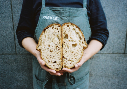 サンフランシスコのベーカリーカフェと、カリフォルニアキュイジーヌをルーツとした店主ケイト (Kate Jaksich)とジェイジェイ(Jerry Jaksich)が、「日本に本当に美味しいサワードウブレッドの店を作りたい」という思いで、日本橋にオープンしたベーカリーカフェ「Parklet」。ここでは、天然酵母のパンや、丁寧に関係を築いた生産者から仕入れた素材を使った食事、こだわりのコーヒーやナチュラルワインなどが朝から夕方まで楽しめます。日本橋店は堀留児童公園に隣接しており、公園の一部であるかのような公共性の高い空間となっています。
