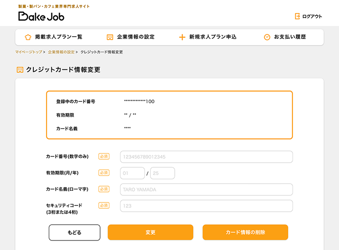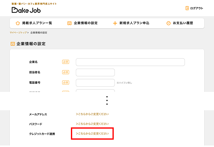 ②企業情報の設定の下部【クレジットカード連携】の【こちらからご変更ください】をクリック