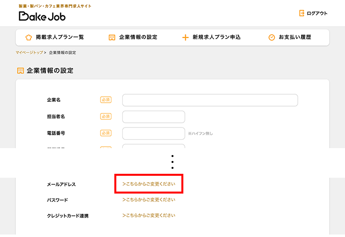 ②企業情報の設定の下部【メールアドレス】の【こちらからご変更ください】をクリック