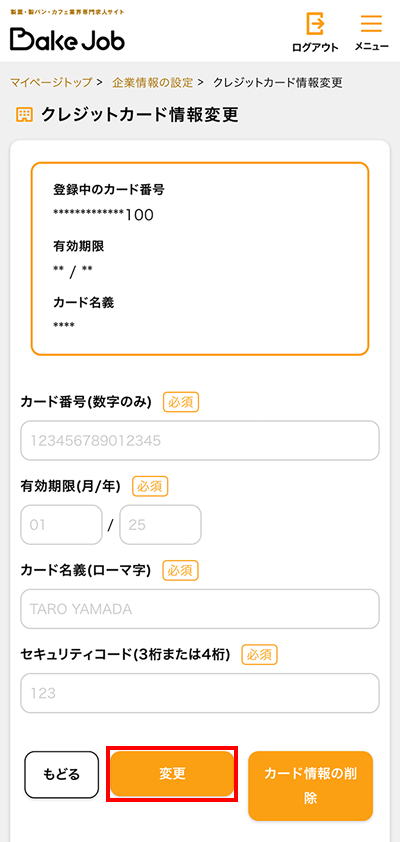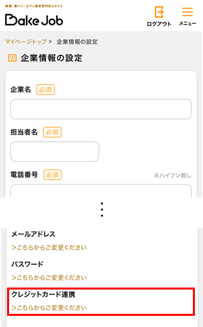 ③企業情報の設定の下部【クレジットカード連携】の【こちらからご変更ください】をタップ
