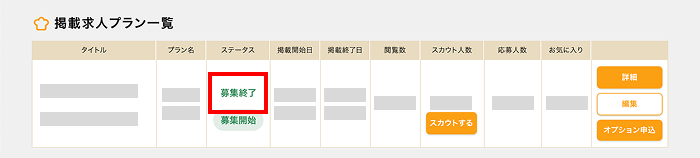 ※先に【プラン停止】をし掲載終了日まで募集中にしたい場合は【募集停止】をせずに、そのままの状態にしていただければ掲載終了日に自動で【募集終了】表示に切り替わります。