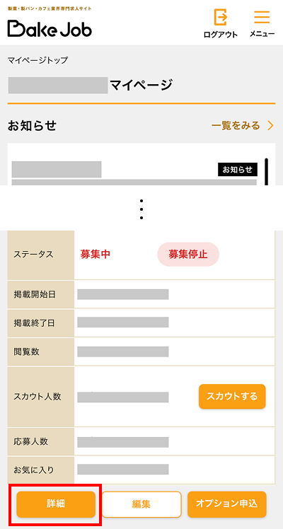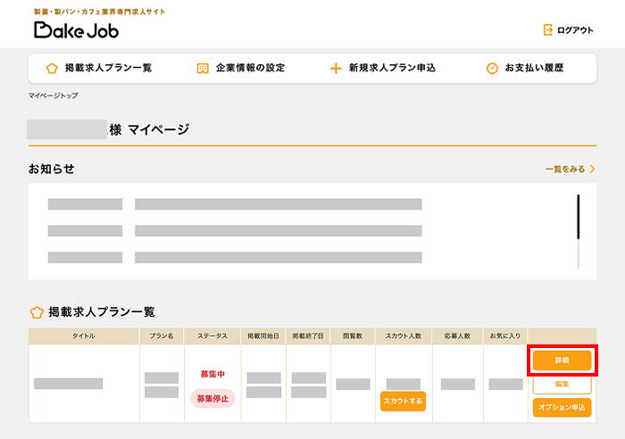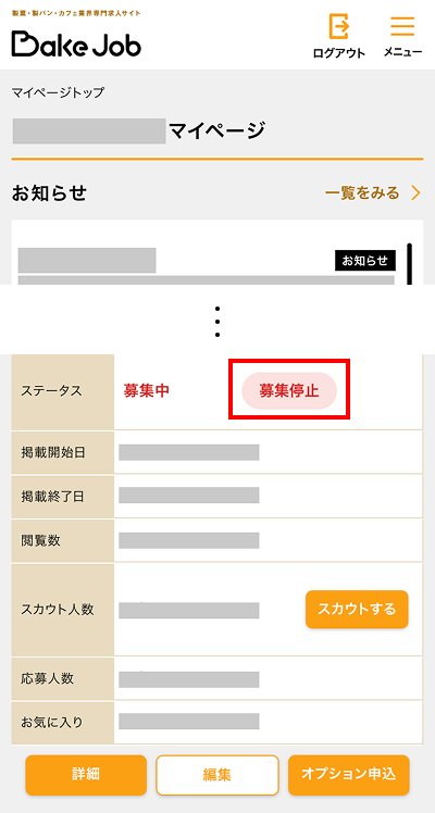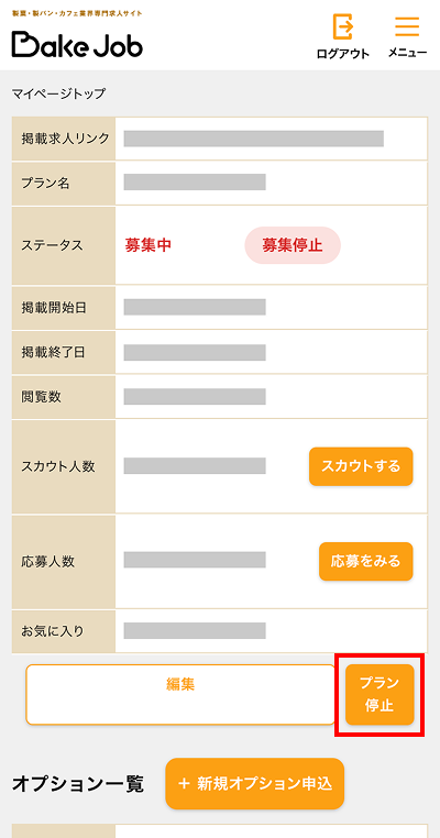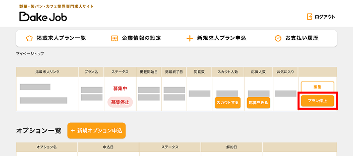 ①ログイン後、マイページの【掲載プラン一覧】のステータス【募集停止】をクリック