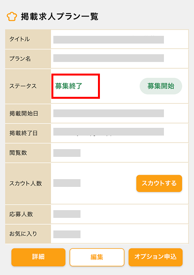 ①ログイン後、マイページの【掲載プラン一覧】のステータス【募集停止】をタップ