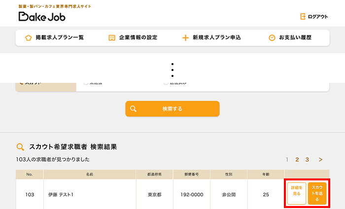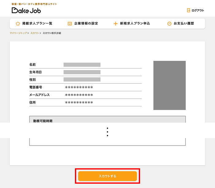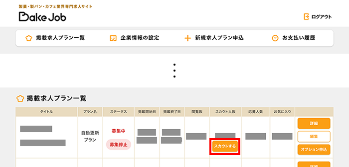 ①ログイン後、マイページトップの掲載求人プラン一覧の【スカウトする】をクリック