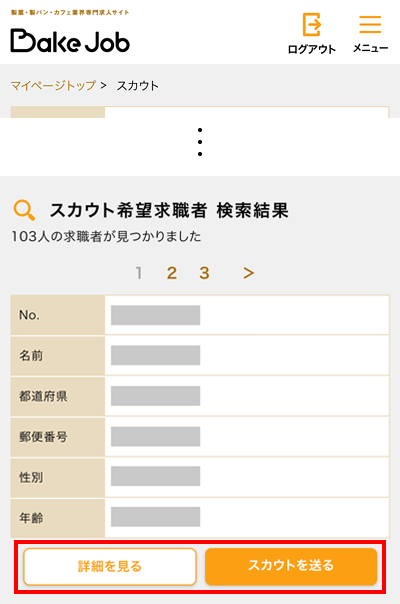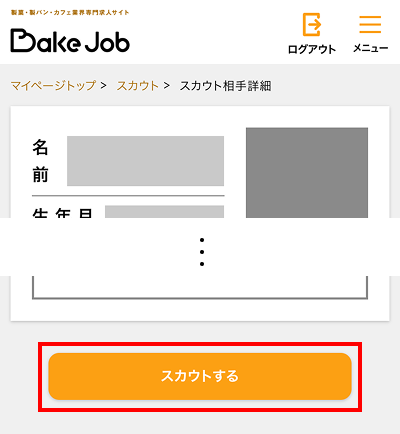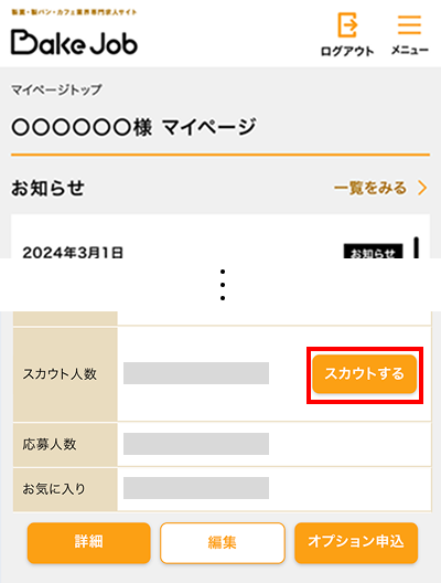 ①ログイン後、マイページトップの掲載求人プラン一覧の【スカウトする】をタップ